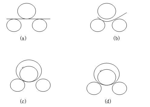 該機(jī)結(jié)構(gòu)形式為三輥對(duì)稱(chēng)式。上輥在兩下輥中間對(duì)稱(chēng)位置作垂直升降運(yùn)動(dòng),通過(guò)蝸輪、蝸桿而獲得,兩下輥?zhàn)餍D(zhuǎn)運(yùn)動(dòng),通過(guò)減速機(jī)的輸出齒輪與下輥齒輪嚙合,實(shí)現(xiàn)板材的行走。當(dāng)上輥的下壓力超過(guò)材料的屈服限度時(shí),便使所卷制的材料變形,變形過(guò)程如下圖: